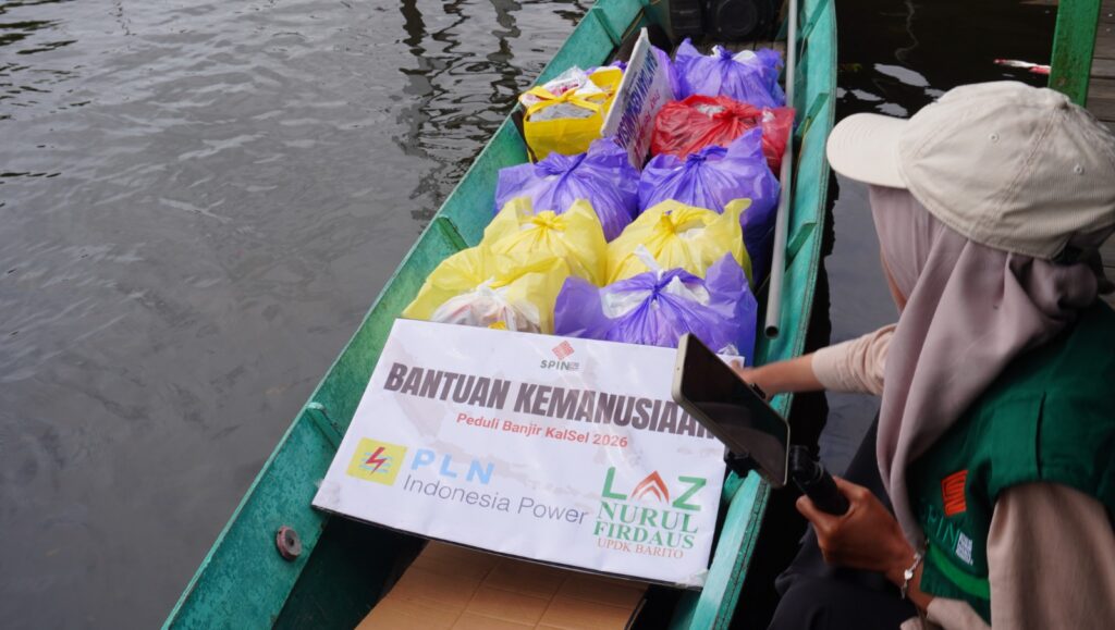 Penyaluran bantuan dilakukan secara langsung ke rumah-rumah warga. Meski kondisi medan cukup sulit akibat genangan air yang masih menyelimuti sebagian wilayah, tim SPIN dan SKIN tetap menjangkau lokasi dengan menggunakan perahu kelotok sebagai sarana transportasi.